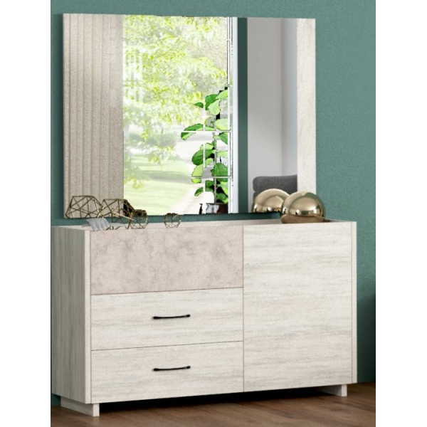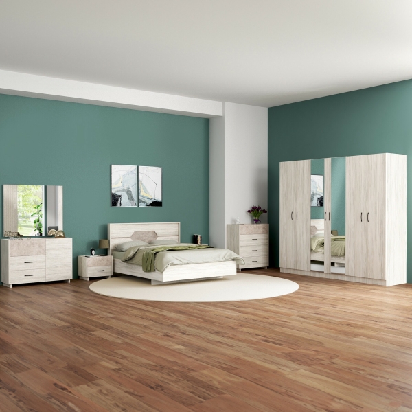 | يتضمن الطقم | 1 سرير + 2 كمدينة + 1 تسريحة + 1 مراية + 1 وحدة أدراج + 1 دولاب غرفة نوم مزوج |