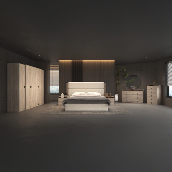 | يتضمن الطقم | 1 سرير + 2 كمدينة + 1 تسريحة + 1 مراية + 1 وحدة أدراج + 1 دولاب غرفة نوم مزوج |