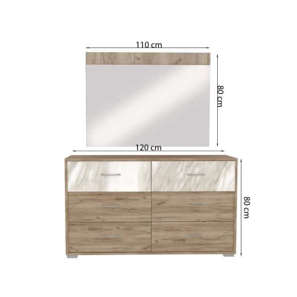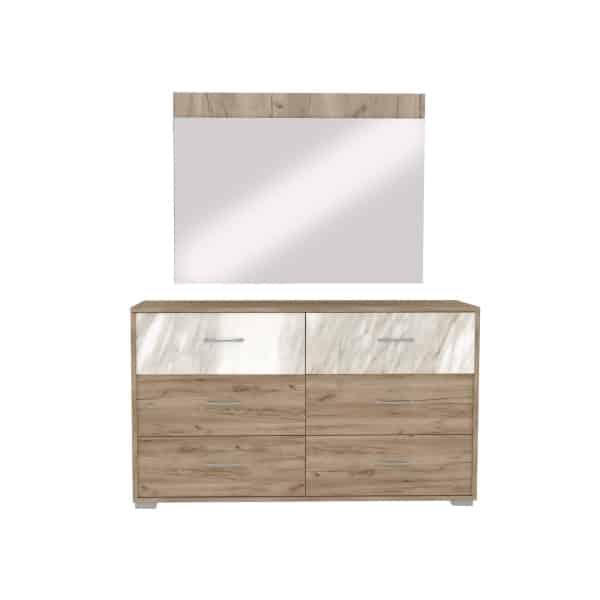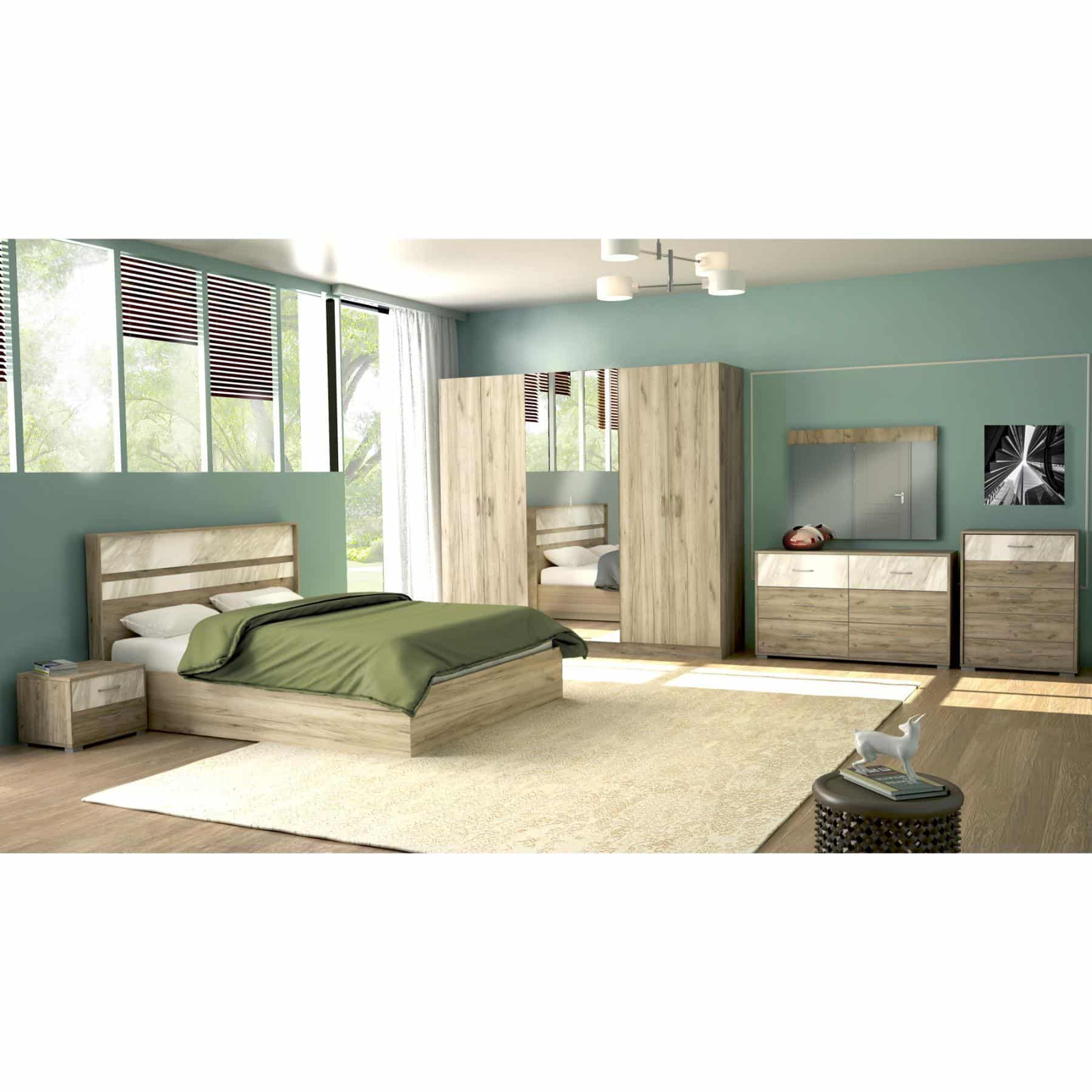 | يتضمن الطقم | 1 سرير + 2 كمدينة + 1 تسريحة + 1 مراية + 1 وحدة أدراج + 1 دولاب غرفة نوم مزوج |