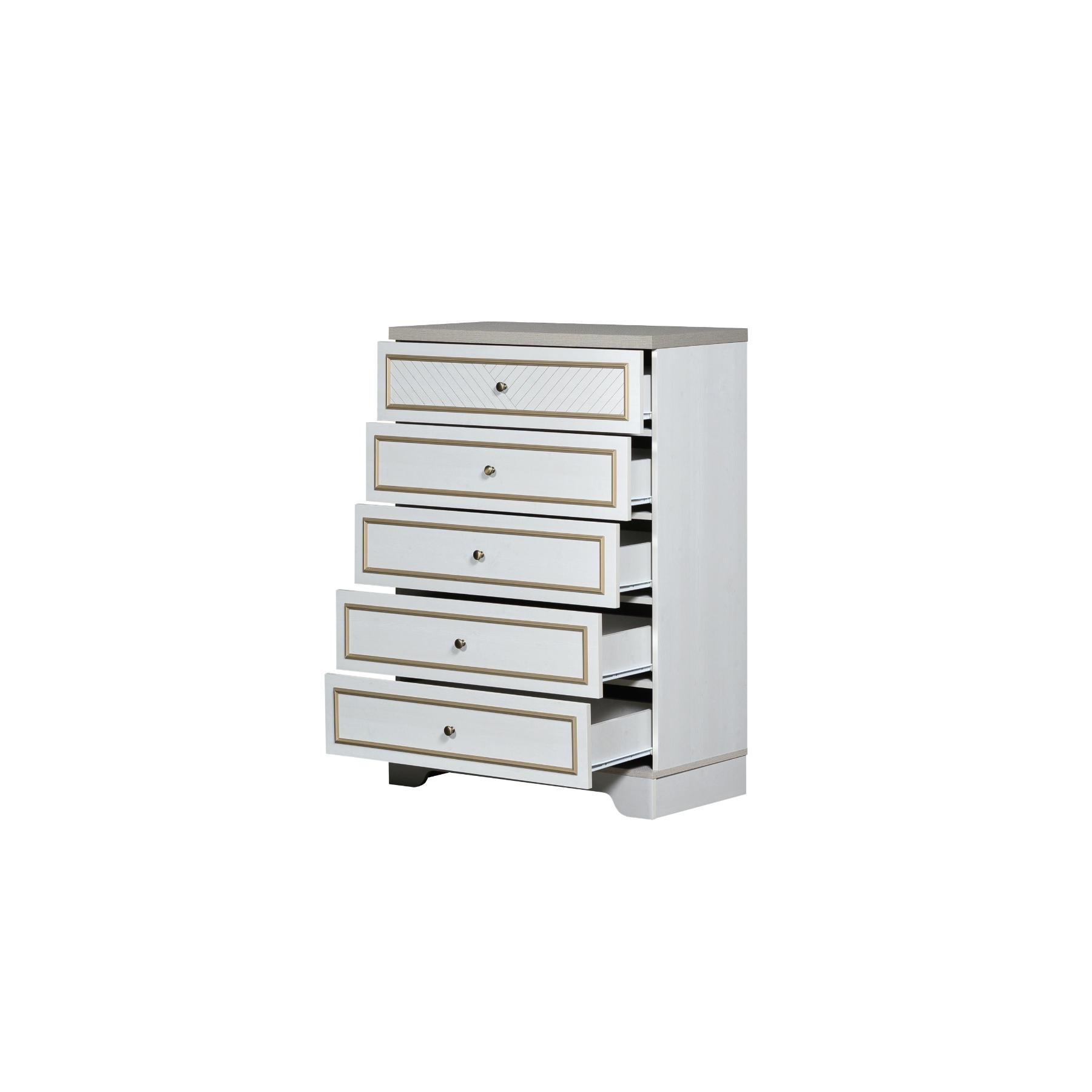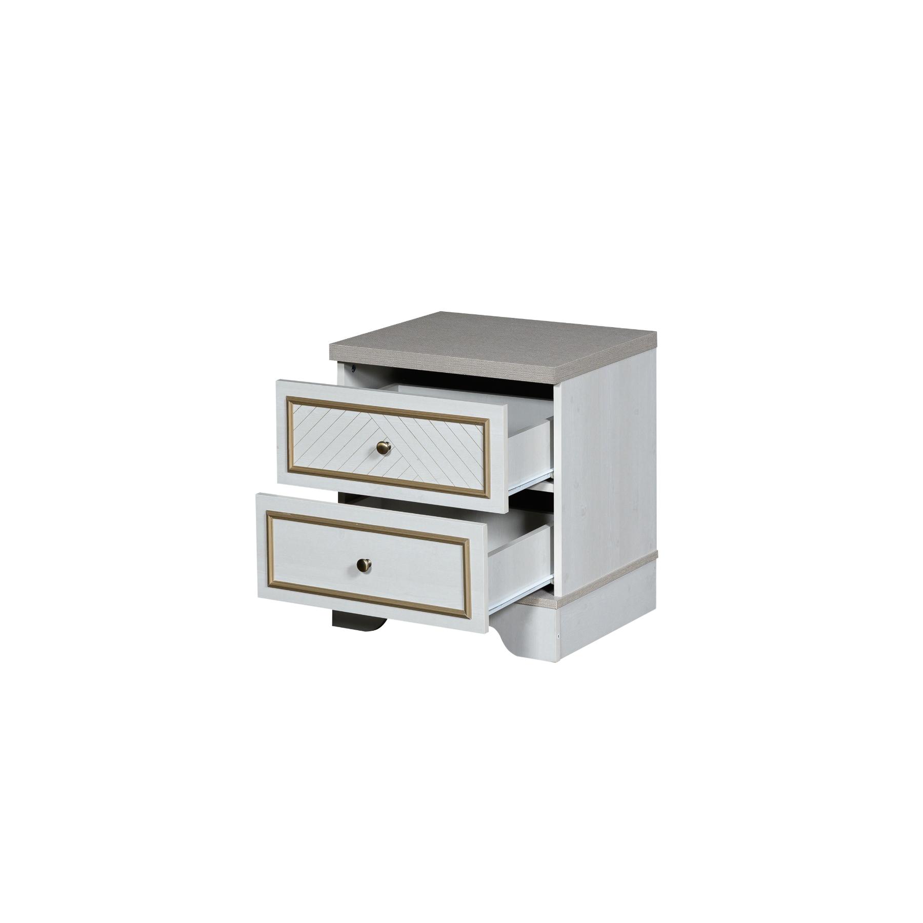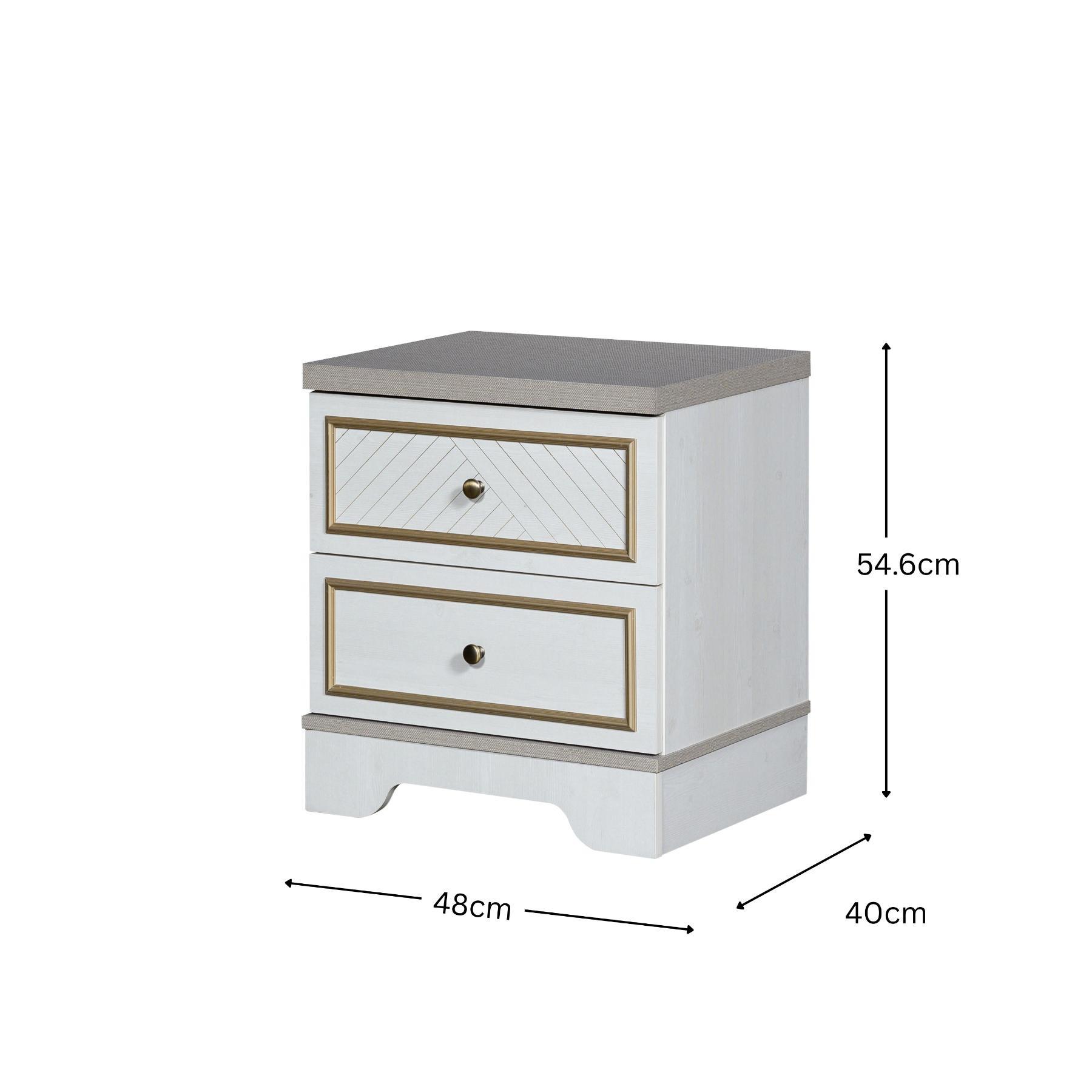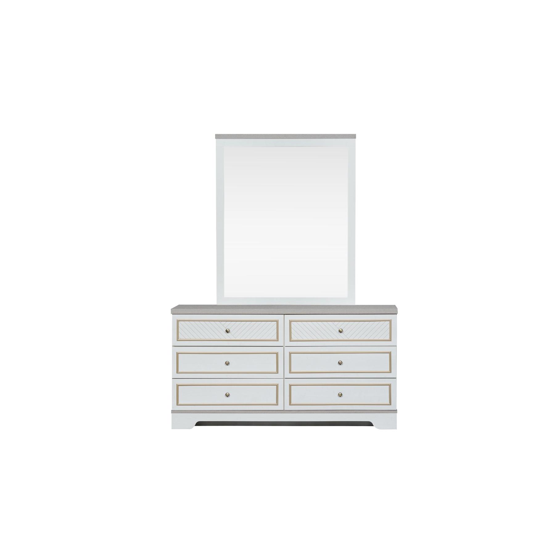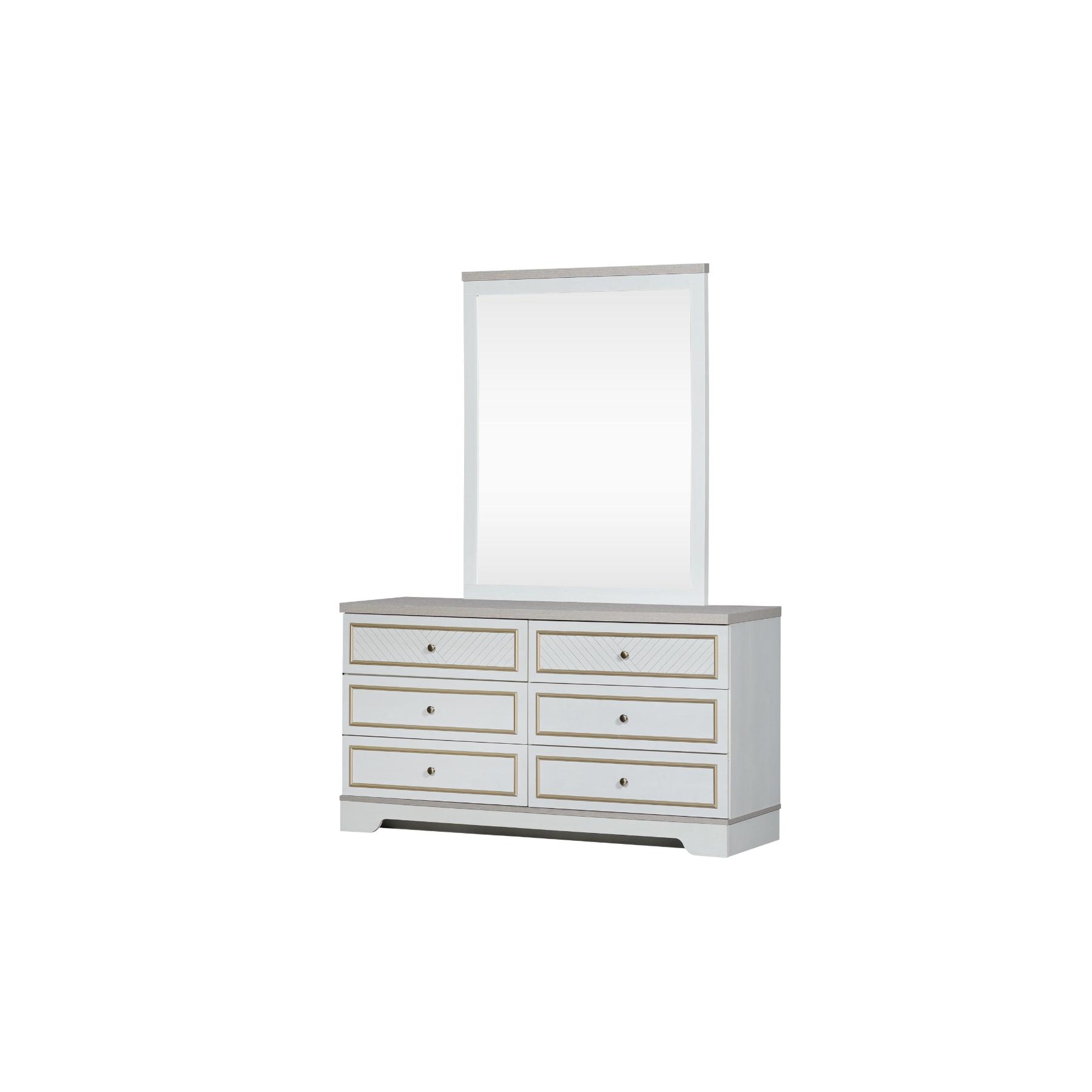 | يتضمن الطقم | 1 سرير + 2 كمدينة + 1 تسريحة + 1 مراية + 1 وحدة أدراج + 1 دولاب غرفة نوم مزوج |