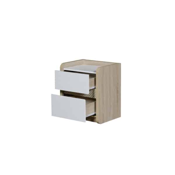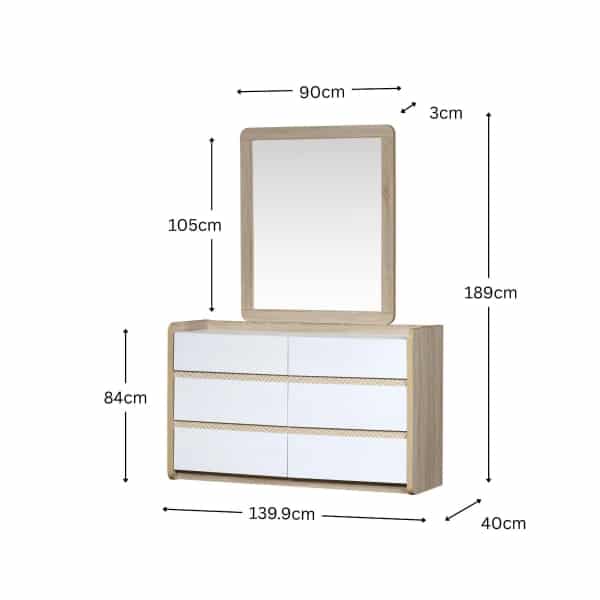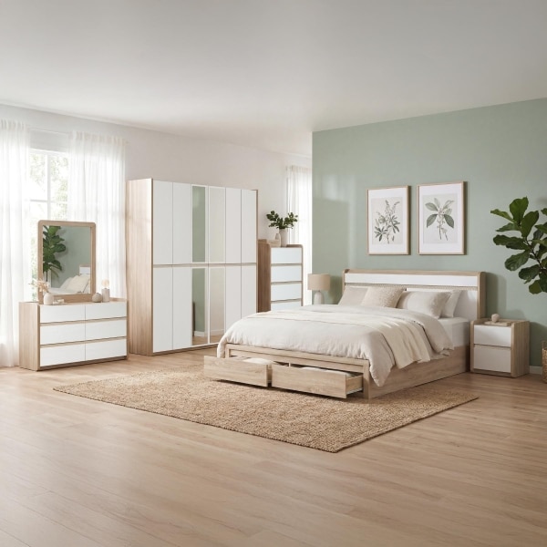 | يتضمن الطقم | 1 سرير + 2 كمدينة + 1 تسريحة + 1 مراية + 1 وحدة أدراج + 1 دولاب غرفة نوم مزوج |