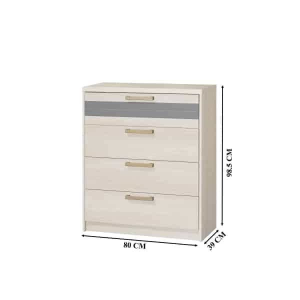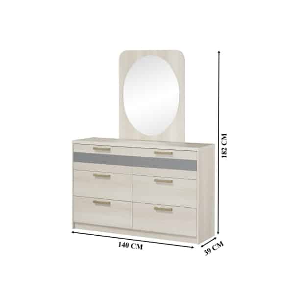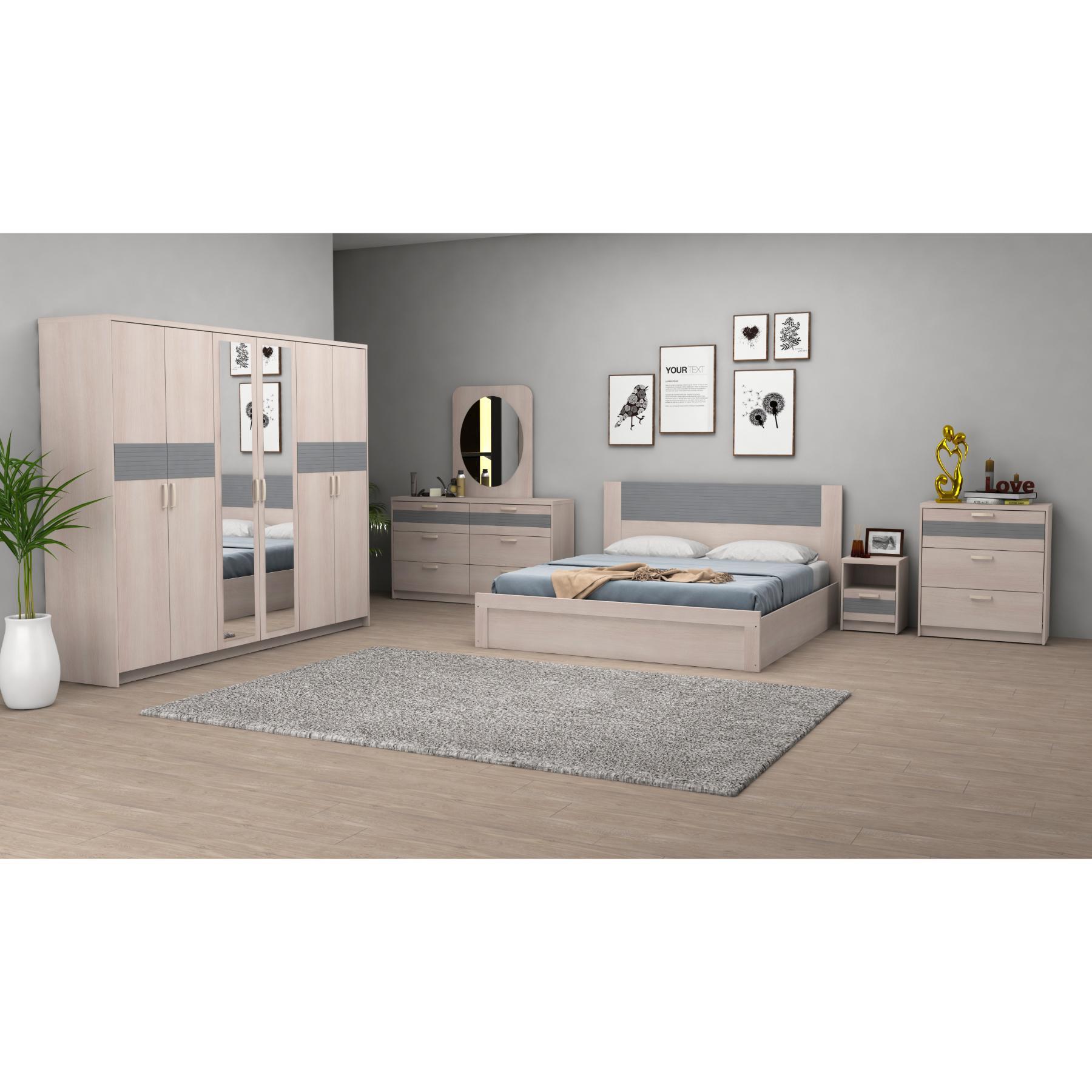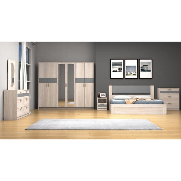 | يتضمن الطقم | 1 سرير + 2 كمدينة + 1 تسريحة + 1 مراية + 1 وحدة أدراج |