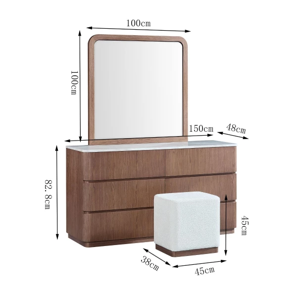| يتضمن الطقم | 1 سرير + 2 كمدينة + 1 تسريحة + 1 مراية + 1 وحدة أدراج + 1 كرسي تسريحة + 1 دولاب غرفة نوم مزوج |