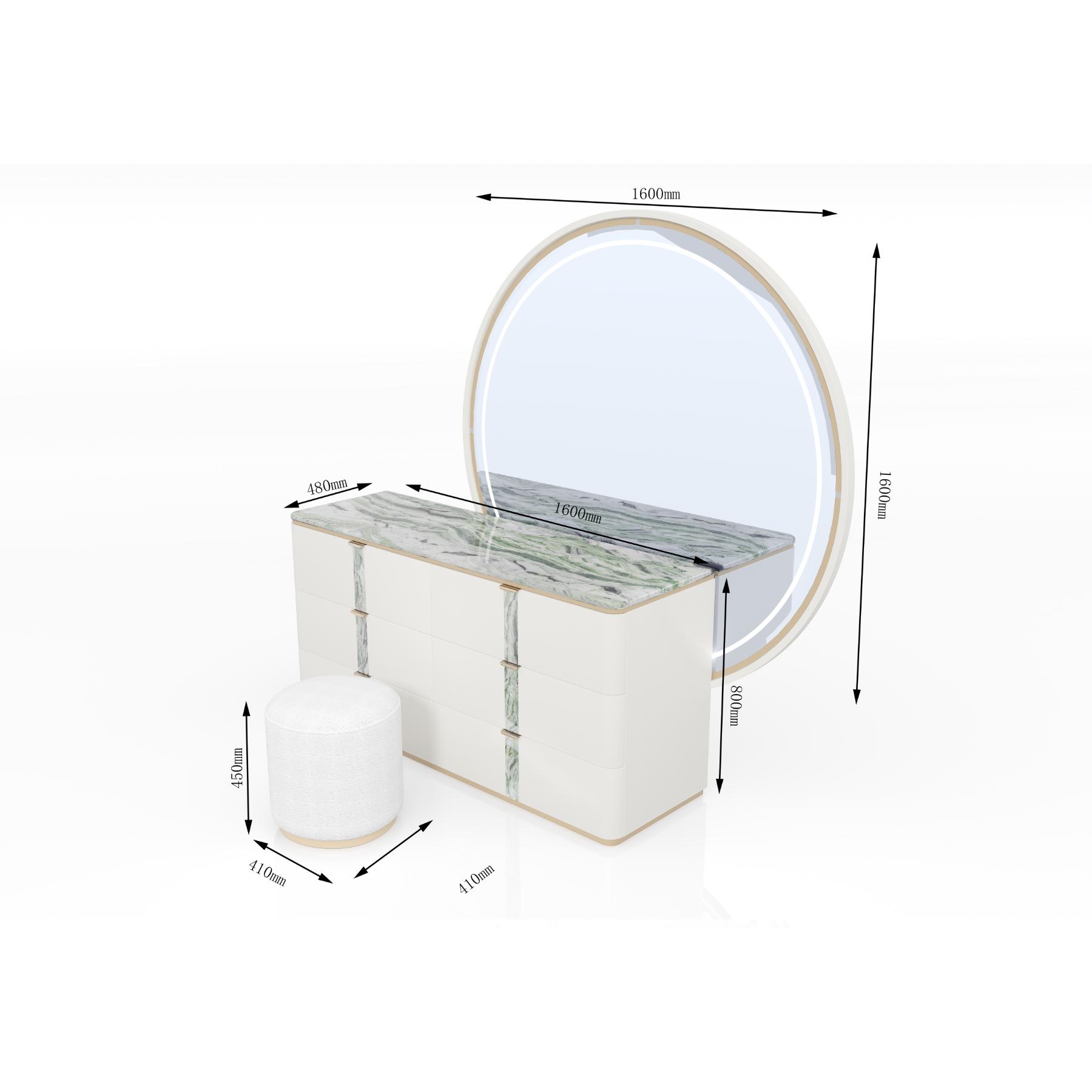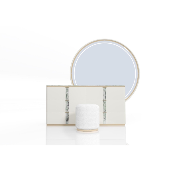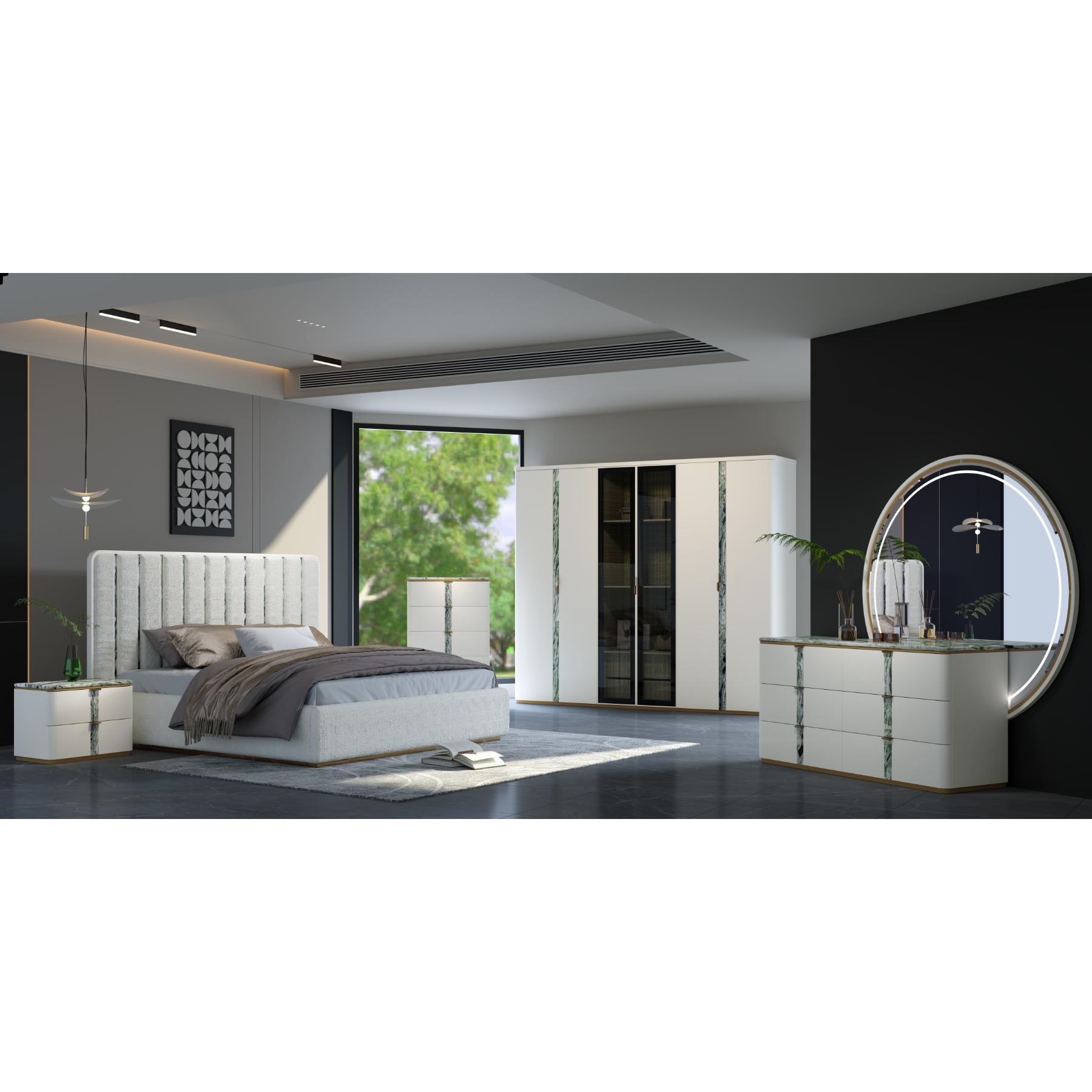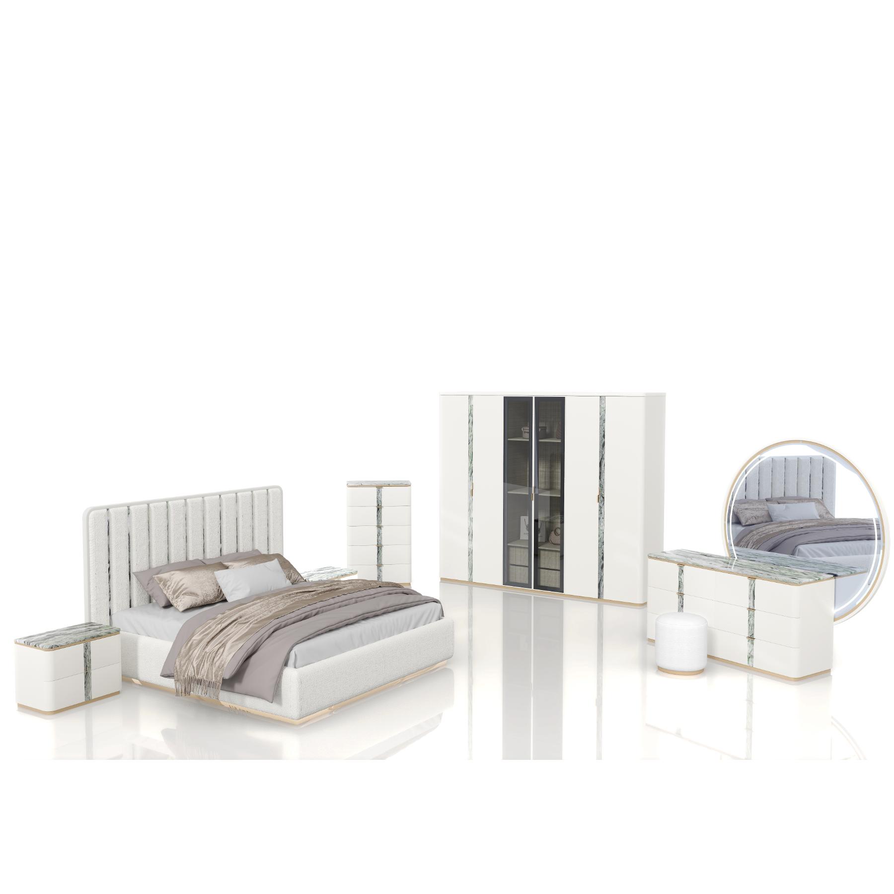 | يتضمن الطقم | 1 سرير + 2 كمدينة + 1 تسريحة + 1 مراية + 1 وحدة أدراج + 1 كرسي تسريحة + 1 دولاب غرفة نوم مزوج |