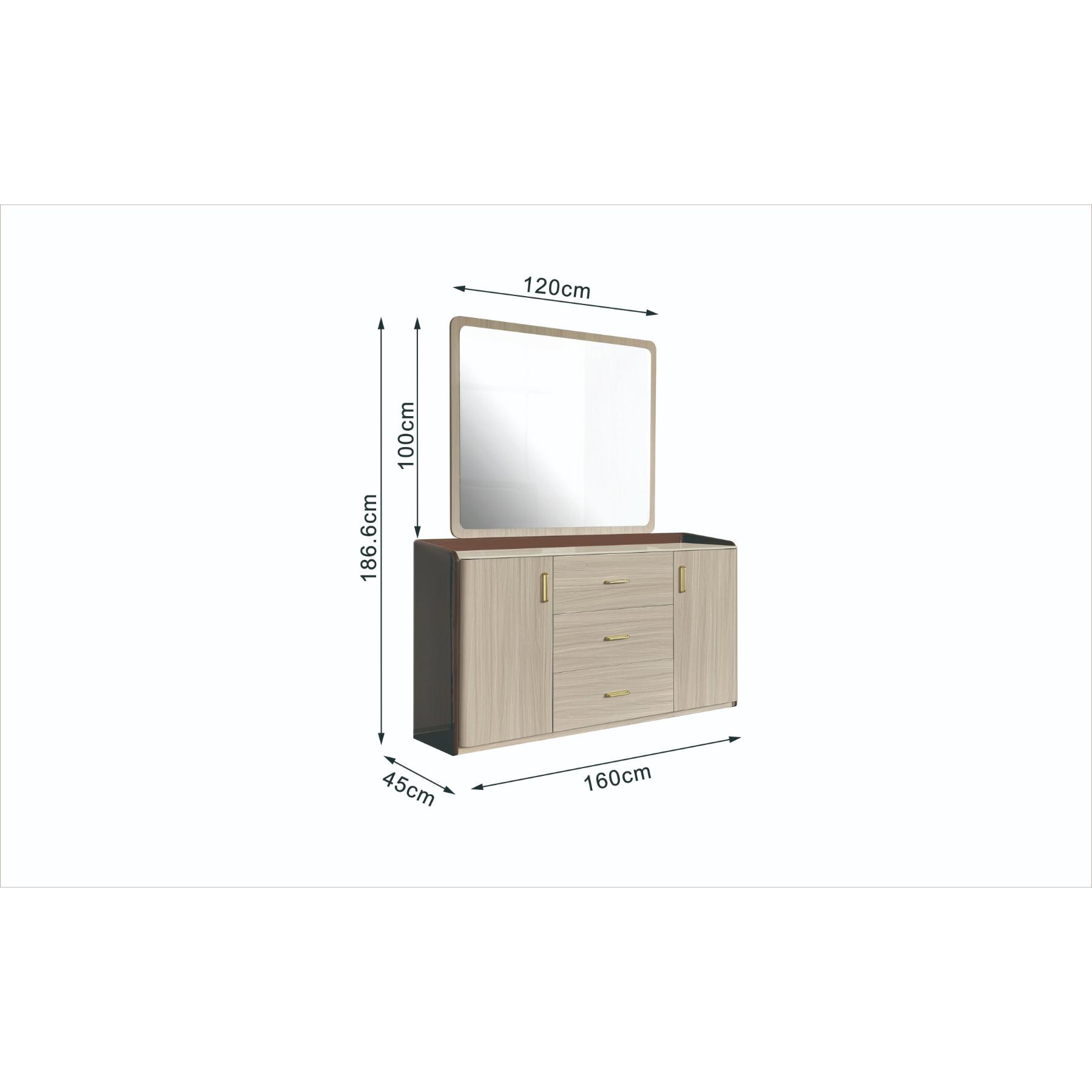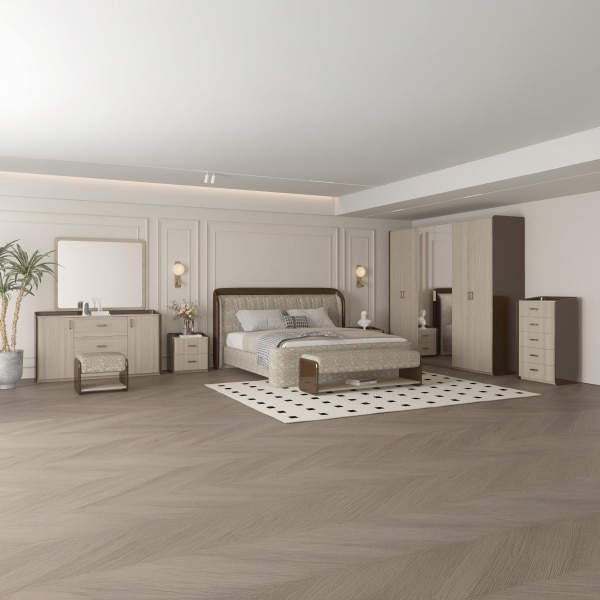 | يتضمن الطقم | 1 سرير + 2 كمدينة + 1 تسريحة + 1 مراية + 1 وحدة أدراج + 1 كرسي تسريحة + 1 دولاب غرفة نوم مزوج |