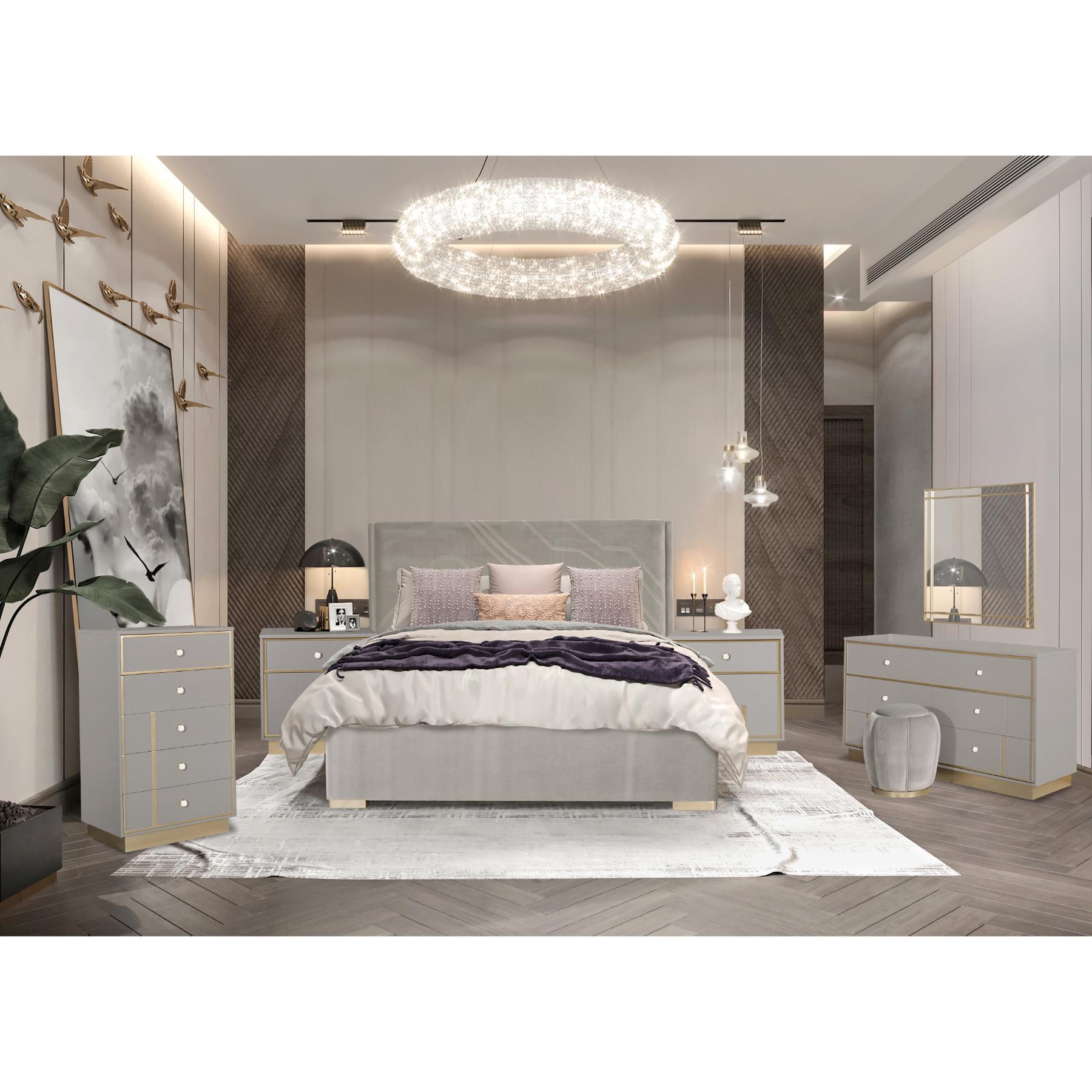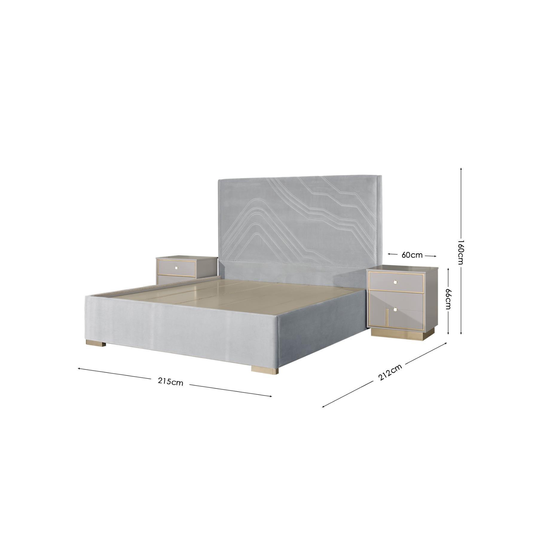 | يتضمن الطقم | 1 سرير + 2 كمدينة + 1 تسريحة + 1 مراية + 1 وحدة أدراج + 1 كرسي تسريحة + 1 دولاب غرفة نوم مزوج |