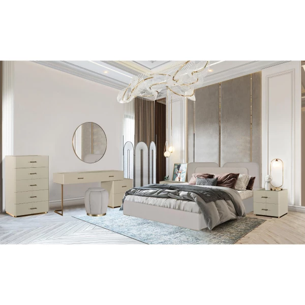 | يتضمن الطقم | 1 سرير + 2 كمدينة + 1 تسريحة + 1 مراية + 1 وحدة أدراج + 1 كرسي تسريحة + 1 دولاب غرفة نوم مزوج |